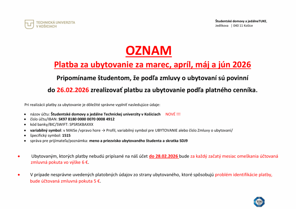 Platby za ubytovanie v ŠD Jedlíkova 9 /marec 2026 – jún 2026/ 4 februára, 2026 Navigácia v článku Predchádzajúci Predchádzajúci článok: Platby za ubytovanie v ŠD Jedlíkova 9 /december 2025 – február 2026/